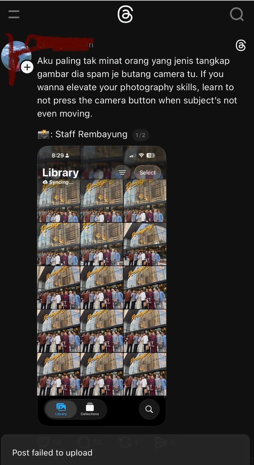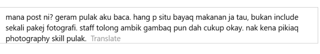 Individu tersebut mengeluh kerana gambar yang diambil itu terlalu banyak dan turut mempertikaikan kemahiran pekerja tersebut dalam mengambil gambar.
