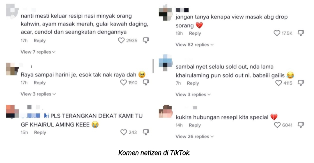 “Nanti mesti keluar resipi nasi minyak orang kahwin, ayam masak merah, gulai kawah daging, acar, cendol dan seangkatan dengannya (merujuk kepada menu kenduri),” komen netizen di Tik Tok