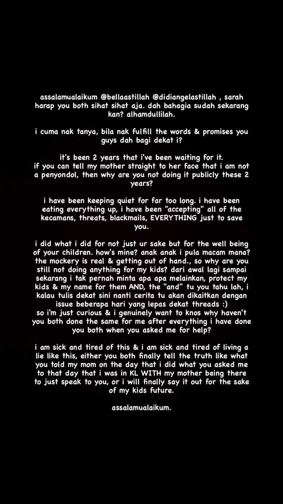 “Saya sudah penat dan muak hidup dalam keadaan begini. Sama ada kamu berdua akhirnya bercakap benar seperti yang kamu katakan kepada ibu saya atau saya sendiri akan mendedahkan perkara sebenar demi masa depan anak-anak saya,” katanya.