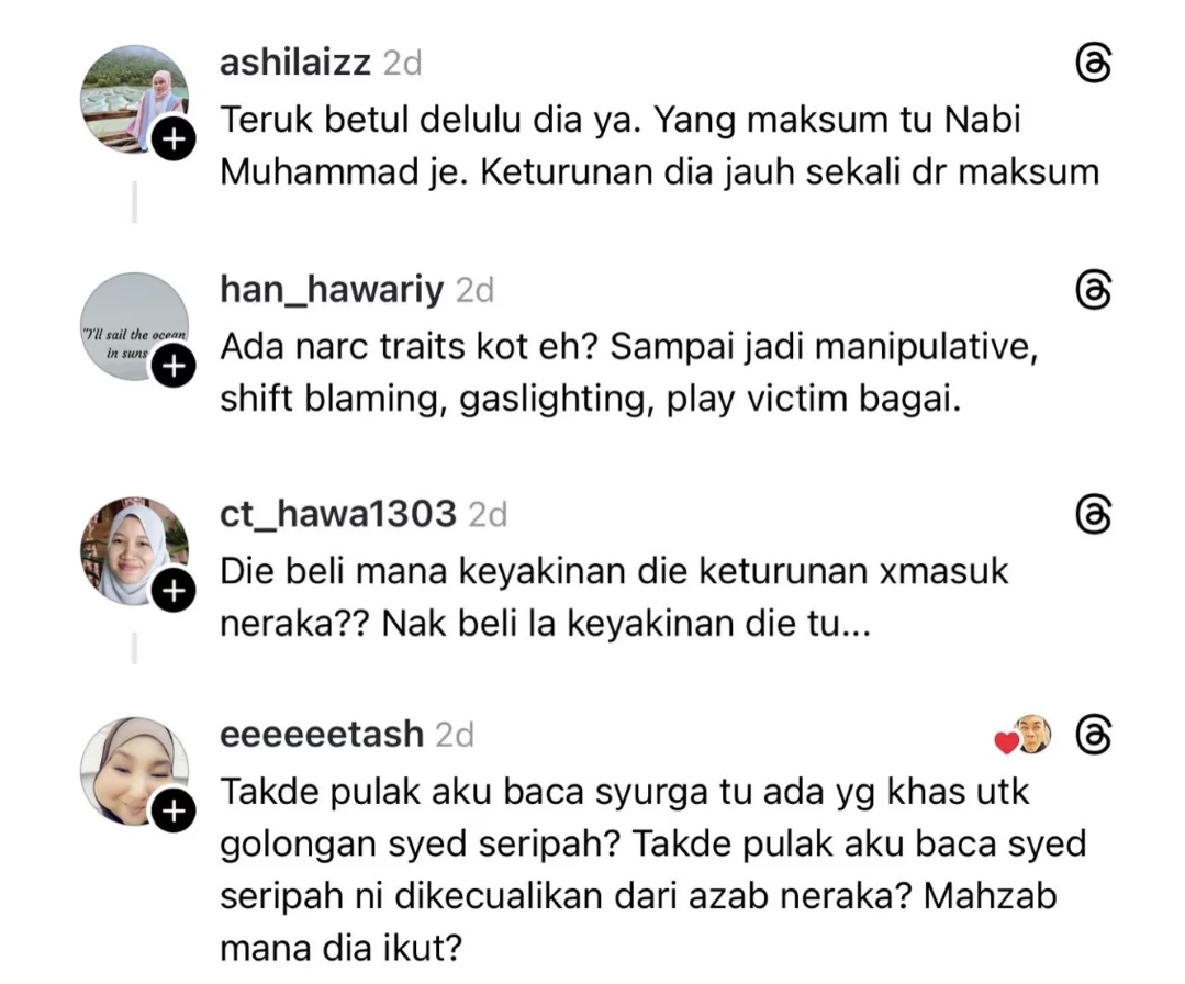 Lebih mencetuskan kemarahan warganet, individu tersebut turut mendakwa Syed sering menyebarkan kepercayaan bahawa keturunan Syed dan Sharifah tidak akan dimasukkan ke neraka walau sebesar mana dosa yang dilakukan.