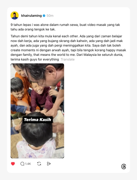 @khairulaming9 tahun lepas i was alone dalam rumah sewa, buat video masak yang tak tahu ada orang tengok ke tak. Tahun demi tahun kita mula kenal each other. Ada yang dari zaman belajar now dah kerja, ada yang bujang skrang dah kahwin, ada yang dah jadi mak ayah, dan ada juga yang dah pergi meninggalkan kita. Saya dah tak boleh create moments ni dengan arwah ayah, tapi bila tengok korang happy masak dengan family, that means the world to me. Dari Malaysia ke seluruh dunia, terima kasih guys for everything