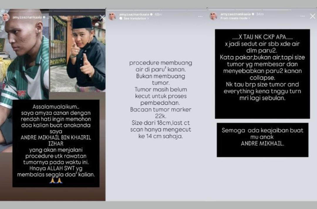 PELAKON Amyza Aznan berkongsi perkembangan terkini keadaan kesihatan anaknya, Andre Mikhail, yang kini sedang berdepan ujian berat selepas disahkan menghidap kanser paru-paru.