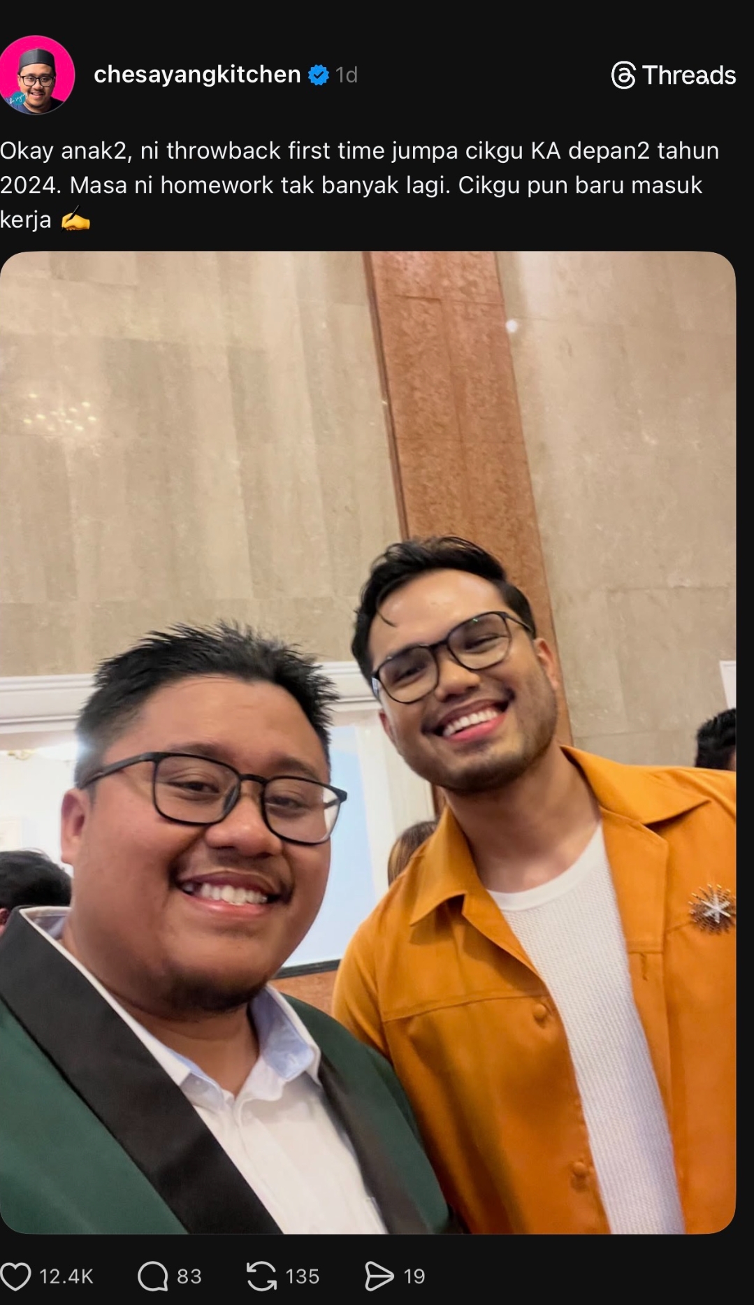 Abdul Qayyum Halid atau Che Sayang berkongsi foto throwback pertama kali bertemu Khairul Aming pada tahun 2024 di platform Threads.